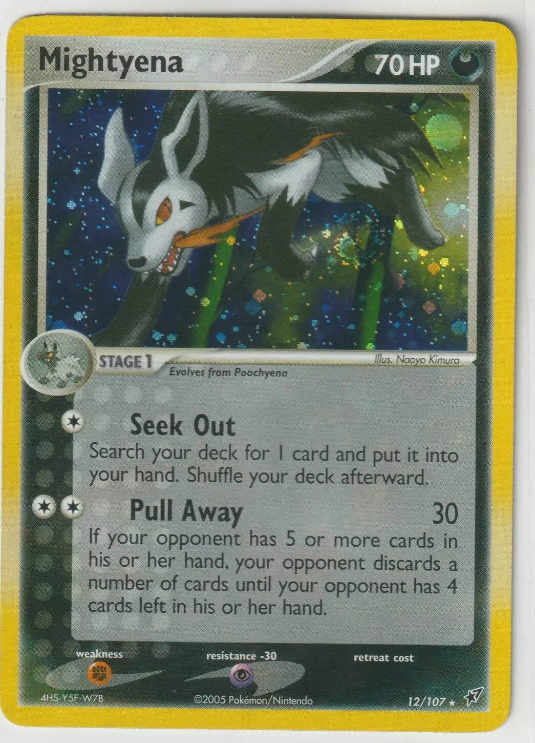 Front: The card features Mightyena, a Stage 1 Pokémon with 70 HP. The holographic background shines behind Mightyena as it prepares to strike. Its attacks include "Seek Out," which lets you search for a card in your deck, and "Pull Away," which forces your opponent to discard cards based on their hand size.