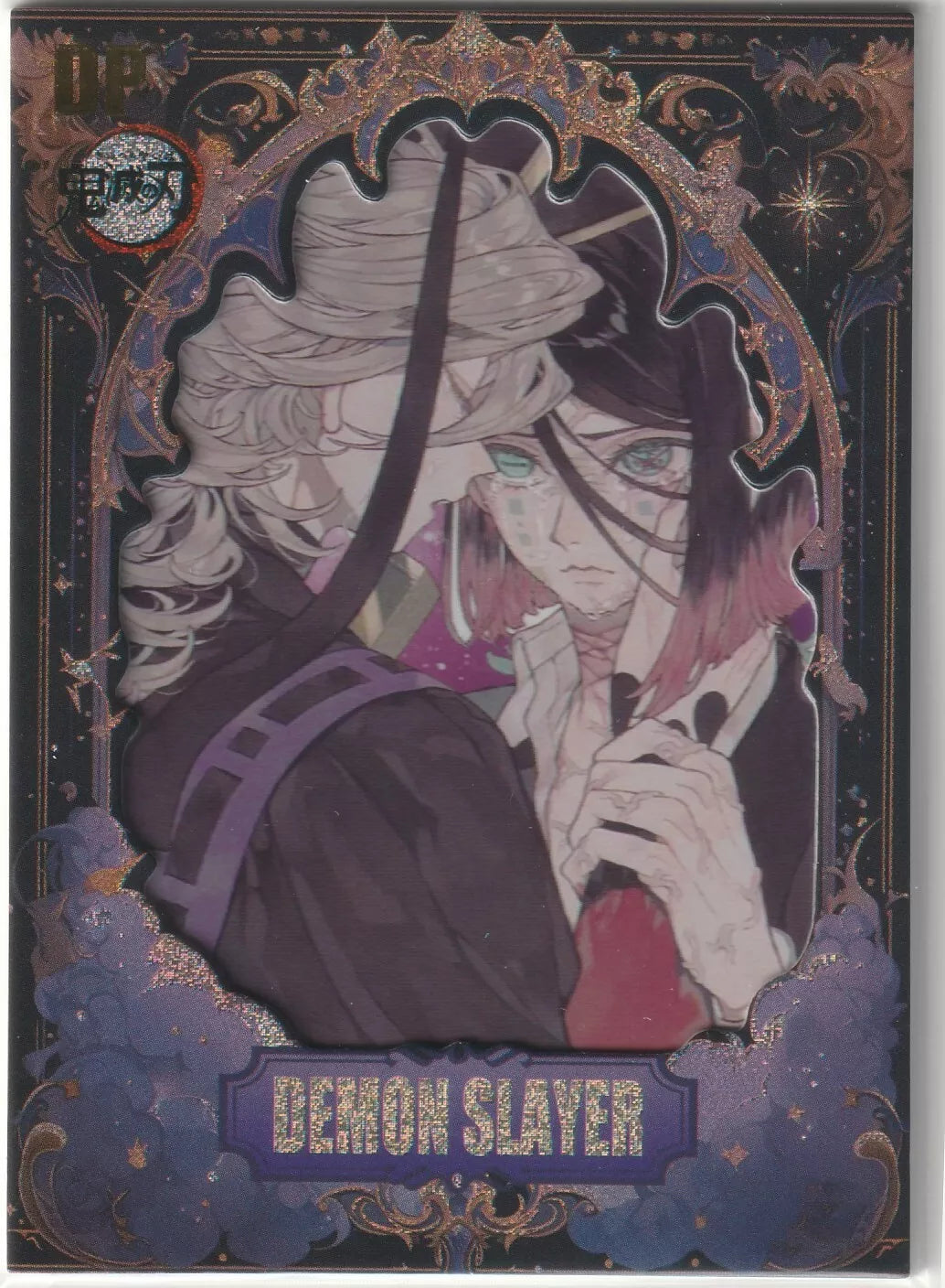 Front: This beautifully detailed card features Rui and Enmu, two prominent demons from the Mugen Train arc, in a striking scene that captures their eerie bond. The intricate design is framed in rich purple and gold, adding depth and elegance to the card. Rui, the Lower Moon Five, is depicted in his delicate yet dangerous spider demon form, while Enmu, Lower Moon One, offers a chilling, sinister expression. The holographic finish enhances their features, making them stand out within the ornate, mystical frame, bringing the demons’ haunting beauty to life.