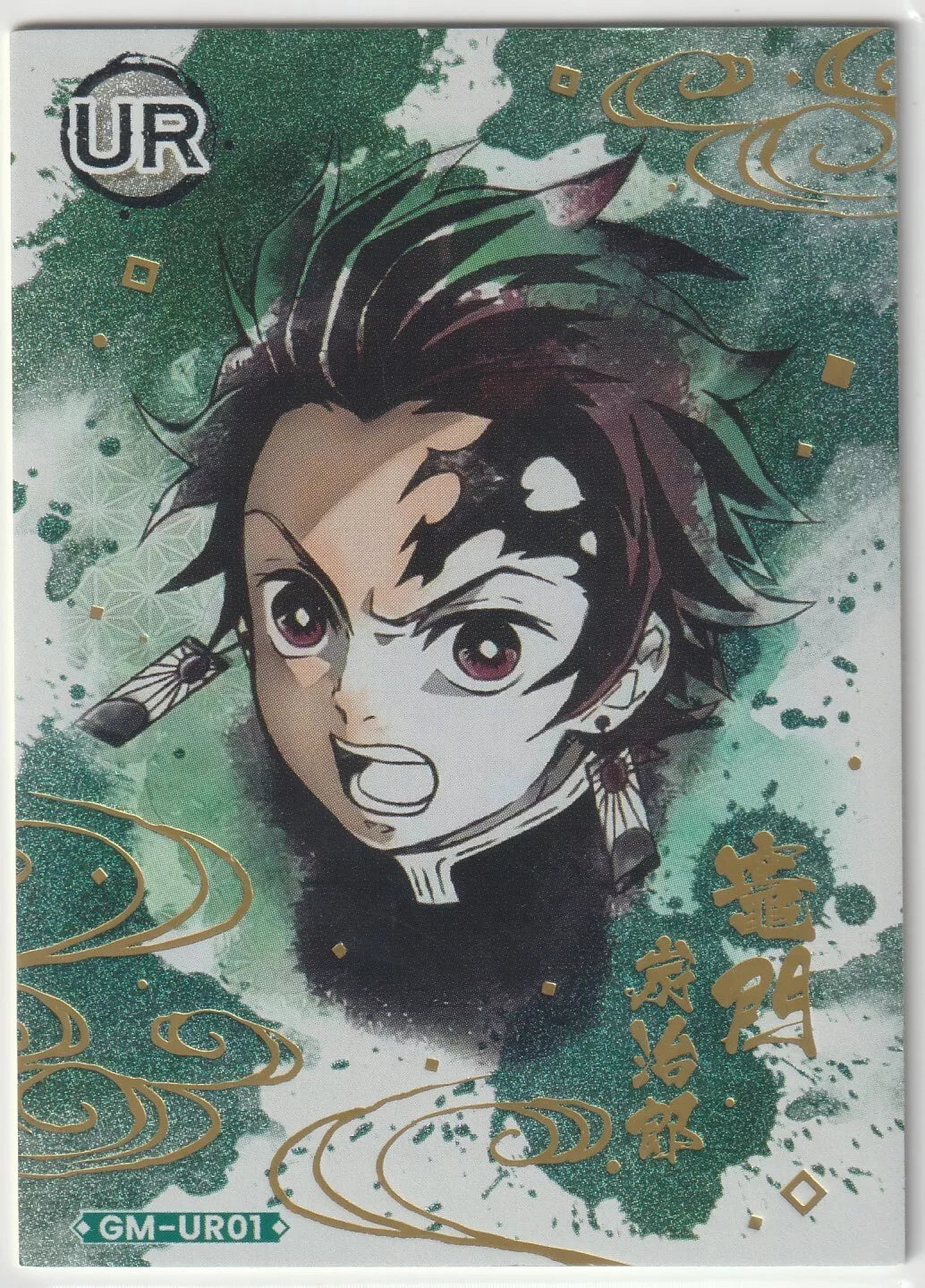 Front: The card features a dynamic, highly detailed portrait of Tanjiro Kamado with a fierce expression. His face is in mid-battle, highlighted by his signature red scar on the left side of his forehead. The background is a vibrant mix of swirling, sparkling green hues and ornate golden clouds, which enhance the sense of motion and energy. The "UR" symbol is placed prominently in the top left corner, indicating the card's Ultra Rare status. Tanjiro’s name is written in elegant golden kanji script on the right, with additional embellishments to emphasize the prestige of the card.