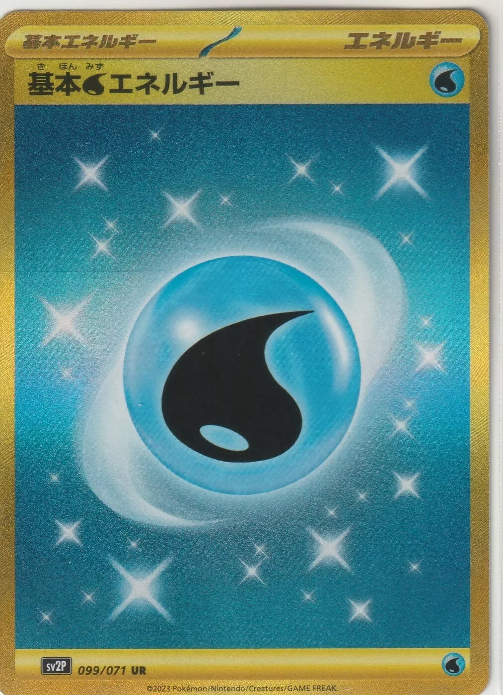 Front: This stunning 2023 Pokémon Card from the Scarlet & Violet series features the Full Art Japanese version of the Water Energy card. The card's vibrant design showcases a shimmering blue Water Energy symbol against a backdrop of glimmering stars, creating a visually striking contrast with the golden border. The attention to detail in the holographic elements adds an extra layer of depth to this collectible, making it a standout piece in any collection.