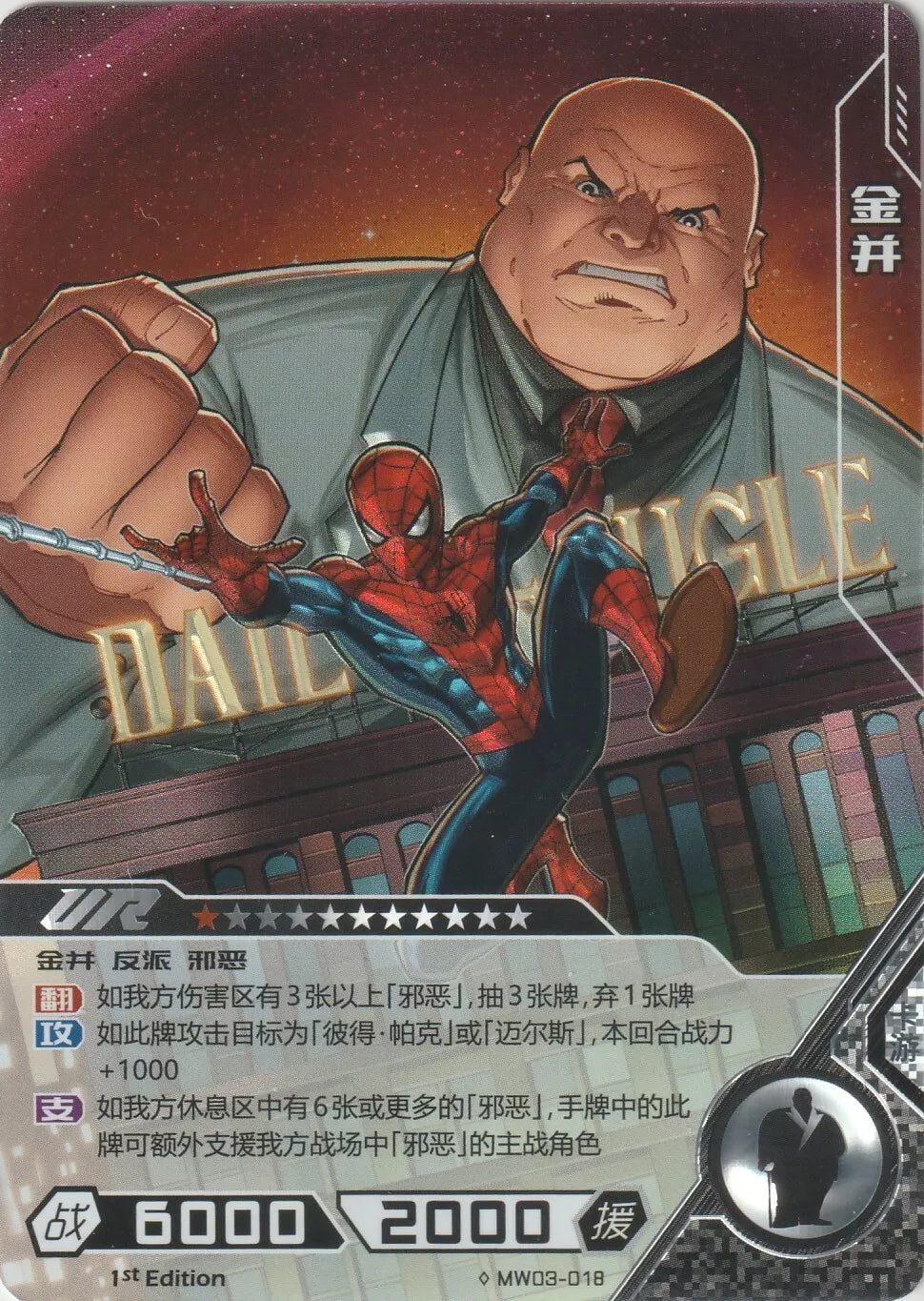 Front: Spider-Man swinging forward with web in hand, facing off against a looming Kingpin in the background. The "Daily Bugle" building is visible behind them, adding an authentic Marvel setting. The card text includes stats and abilities written in Chinese, with "UR" indicating Ultra Rare status, and the card number "MW03-018" visible at the bottom.