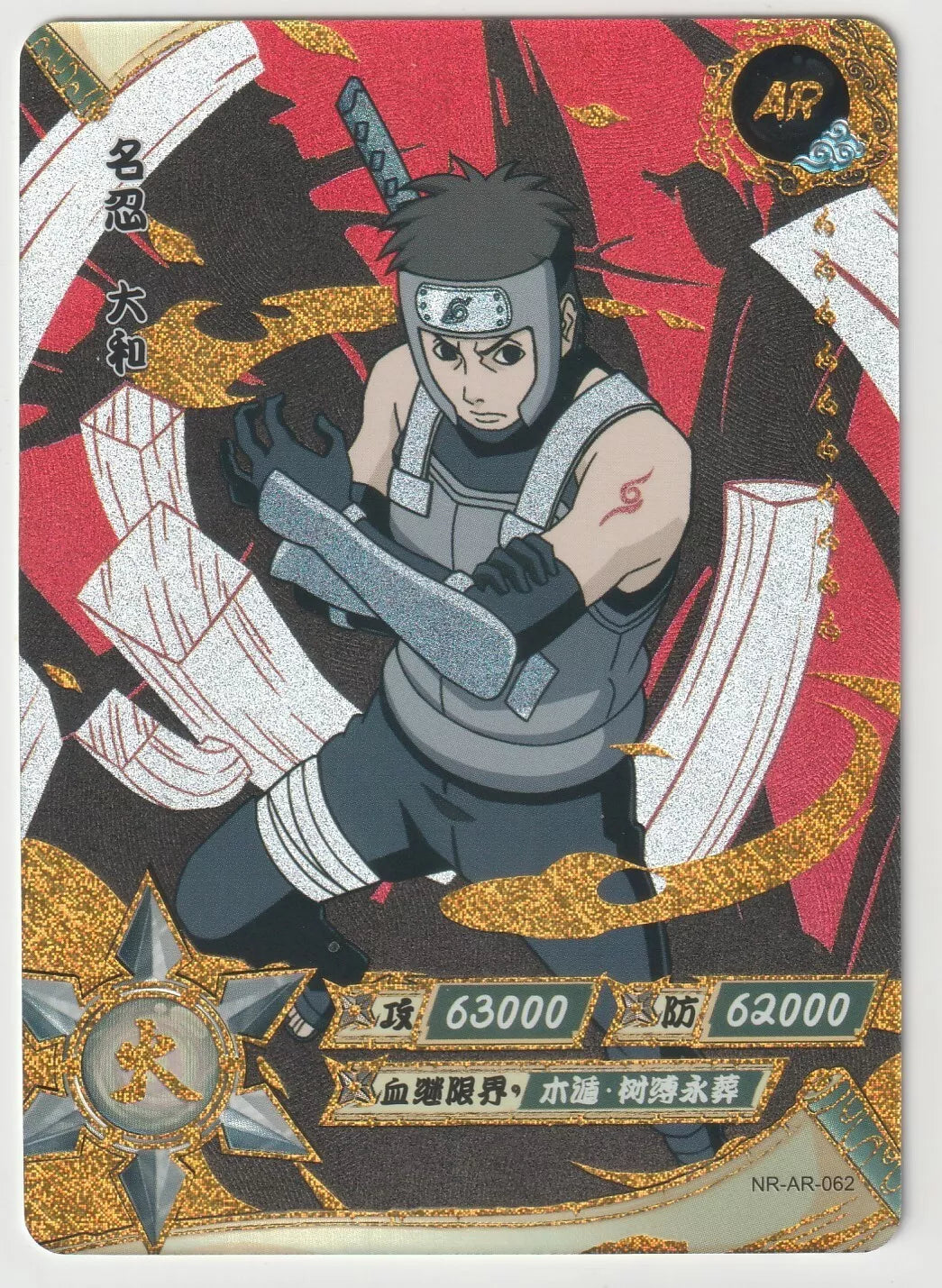 Front: This NR-AR-062 Yamato card from the Naruto Kayou Tier 2 Wave 6 set features a striking gold foil textured design. Yamato is depicted in a powerful stance, showcasing his mastery of Wood Release techniques with vibrant details. The card is in excellent condition, with sharp corners and a flawless surface, making it a stunning addition for collectors.