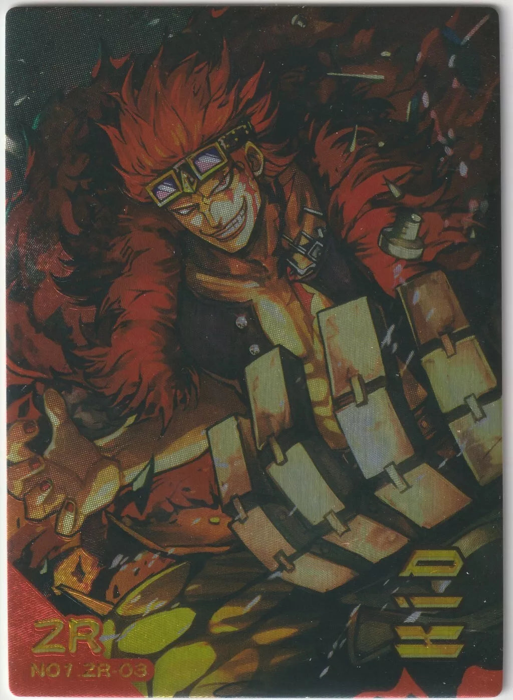ront: This impressive ZR-03 card from the One Piece 26th Anniversary set features Captain Eustass Kidd in a dynamic, metallized design. The card captures Kidd’s fierce and imposing presence, with vibrant colors and intricate foil detailing that highlight his mechanical arm and intense expression, making it a standout piece in any collection.