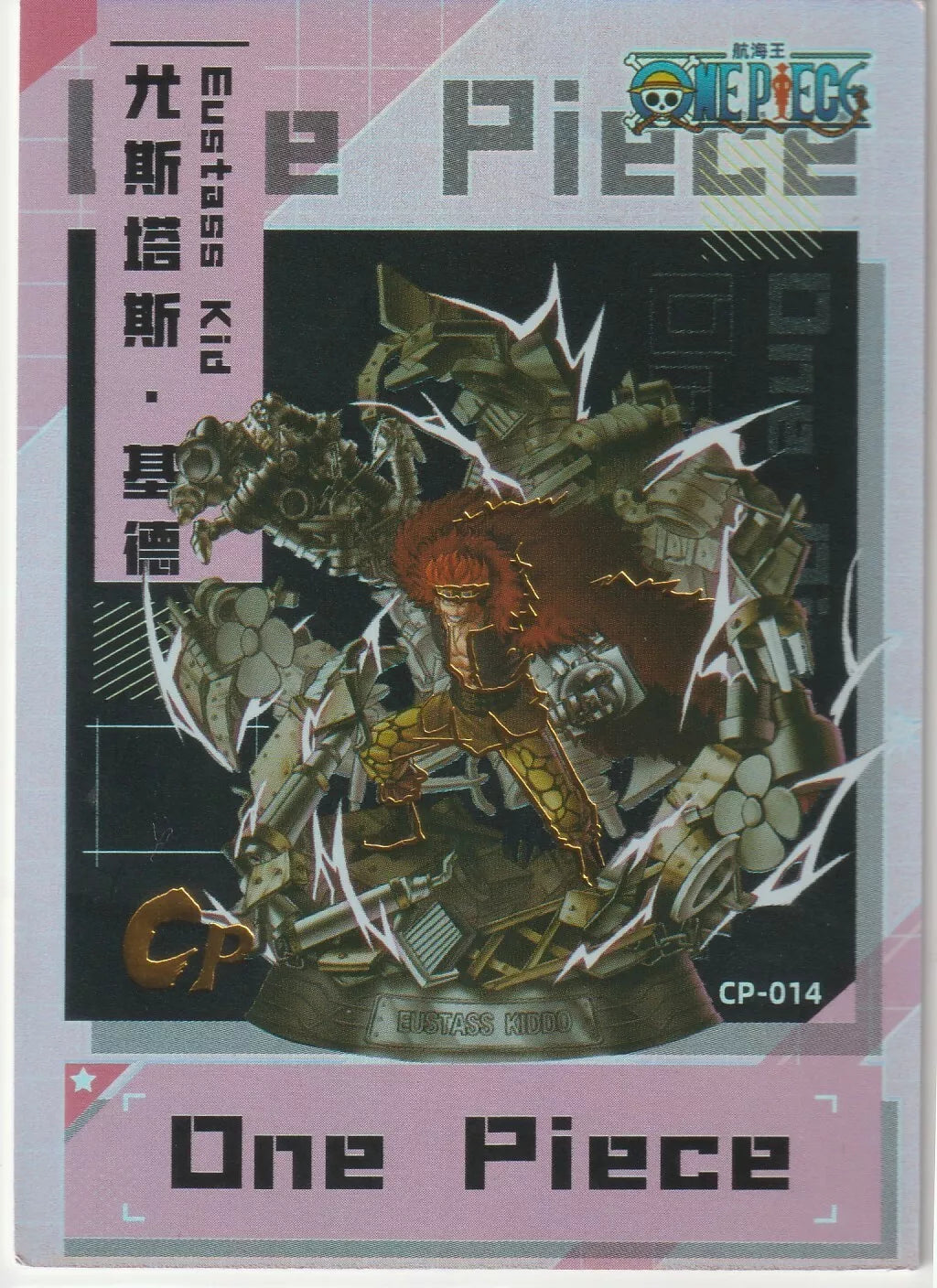 Front: This CP-014 card from the One Piece anime collection features Eustass Kid from the notorious Worst Generation. The detailed illustration captures Kid's menacing pose with his mechanical arm and fierce expression, standing against a backdrop of electrifying energy. The bold colors and intricate design make this card a must-have for One Piece fans.