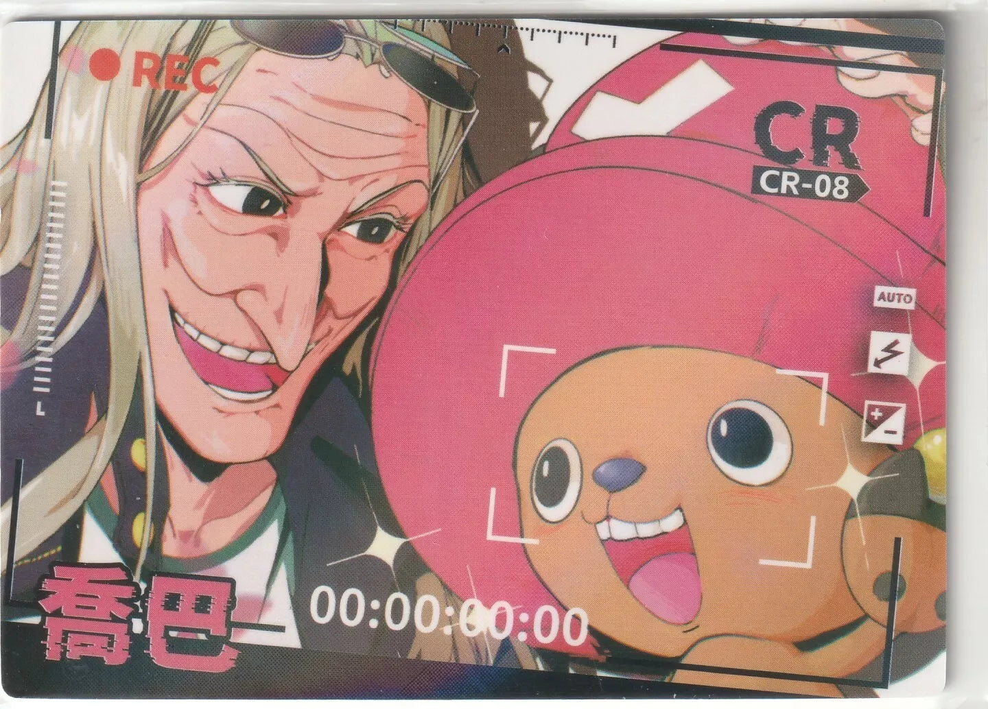 Front: This CR-08 Foil Camera Record card features Tony Tony Chopper alongside Dr. Kureha from the beloved One Piece series. The dynamic design highlights their cheerful expressions, beautifully captured in high-quality foil. The vibrant colors and camera recording overlay give the card a unique, modern touch.