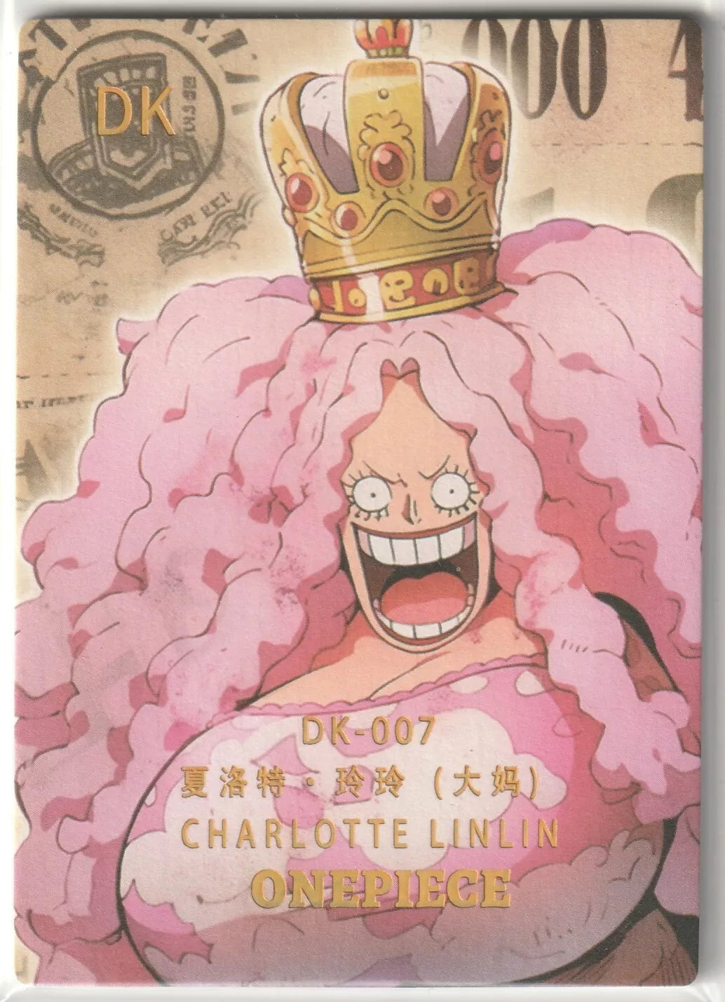 - Image: The front of the card features Charlotte Linlin, also known as Big Mom, one of the Four Emperors of the Sea in One Piece. The artwork captures her massive figure and iconic pink hair, topped with a regal crown. Her wide, menacing grin is instantly recognizable, evoking her fierce reputation. The DK-007 code and her name are displayed in gold text at the bottom, alongside the ONE PIECE title. The card is printed on a thick matte stock, giving it a high-quality, durable feel, perfect for collectors.