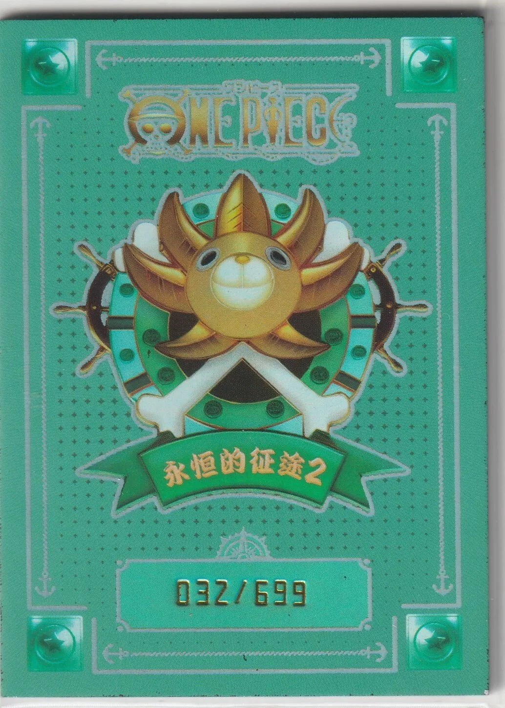 The back of the card features a bright green background with gold accents, including the iconic Sunny Pirate ship emblem at the center. Below the emblem is the card’s limited-edition number "032/699," printed in gold to signify its rarity. The border is detailed with elegant designs, complementing the premium nature of the card, while the One Piece logo is prominently displayed at the top. -