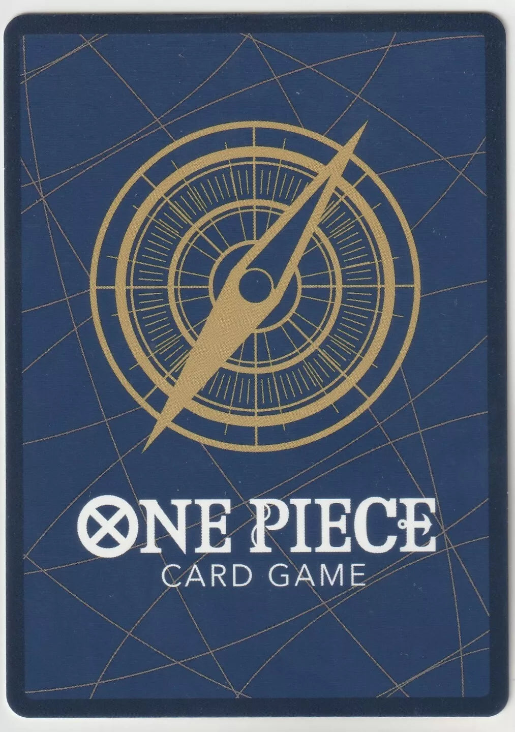 The back of the card is the standard One Piece Card Game design, featuring a golden compass in the center, placed against a navy blue background. The crisscrossing gold lines add a nautical theme, with the words "One Piece Card Game" at the bottom. -