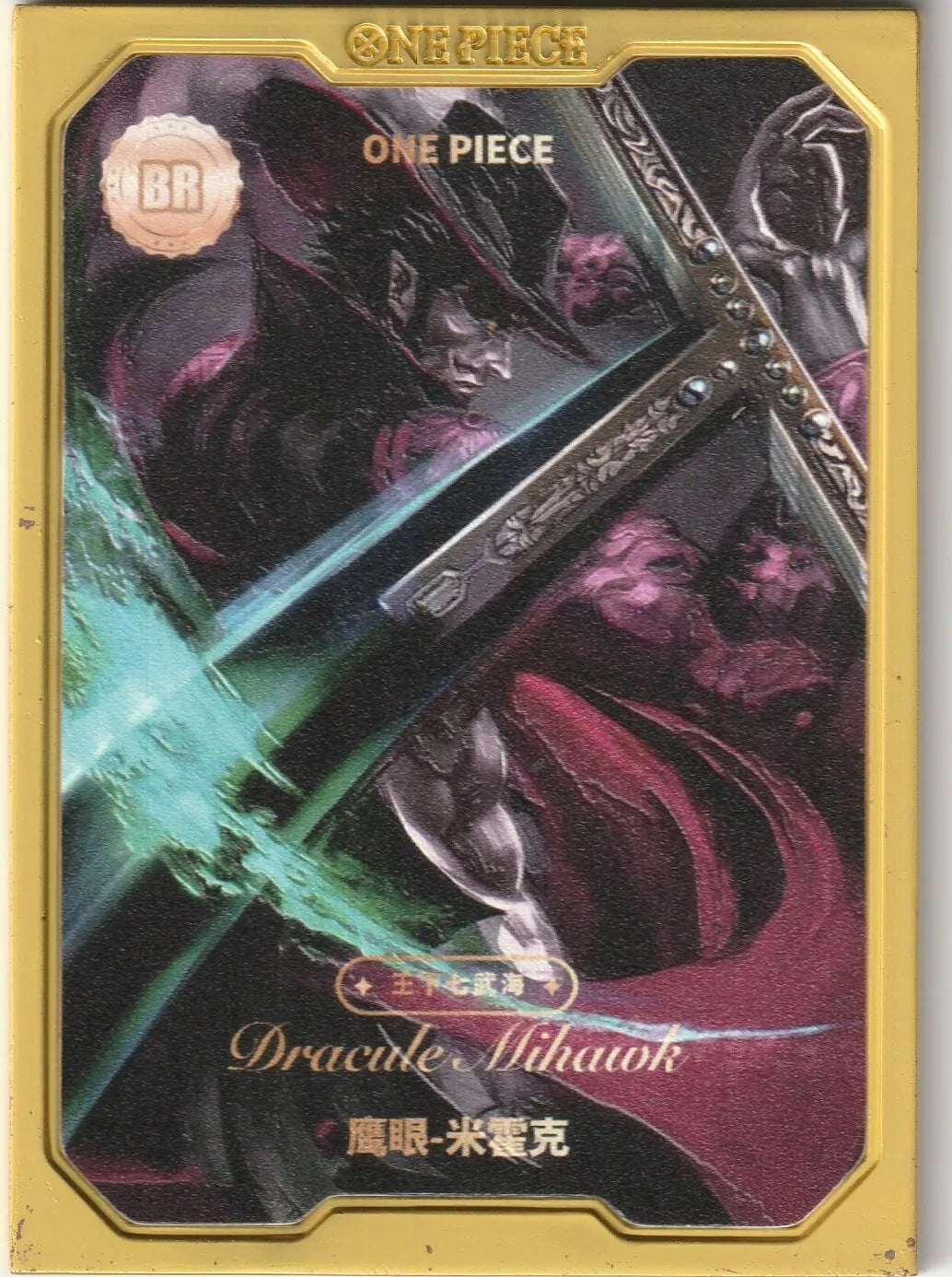 Rarity: BR Character: Dracule Mihawk Design: Oil Painting with Metal Gold Frame Condition: Mint/Near-mint This premium card is an excellent choice for those who appreciate the artistry and strength of one of the most formidable characters in the One Piece universe!