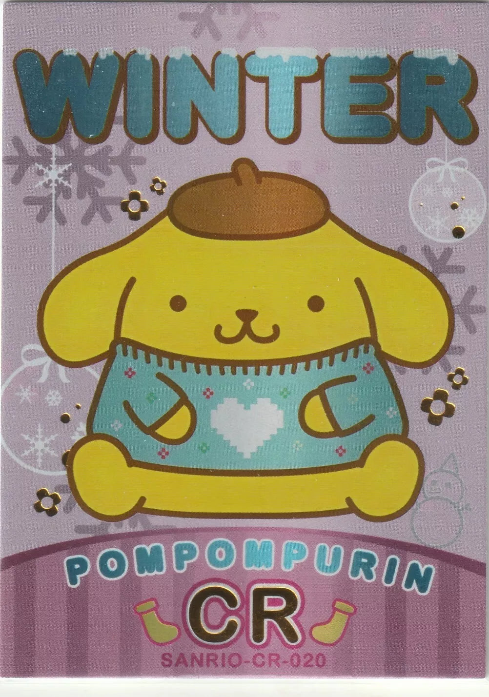 The front of the card features Pompompurin, the lovable golden retriever character from Sanrio, dressed in a cozy winter sweater. The sweater is turquoise with a white heart design at the center, and decorative patterns around the edges. The background is a soft lilac with snowflakes and Christmas ornaments, giving it a wintery, festive feel. Above Pompompurin, the word “WINTER” is displayed in large letters with a gradient blue effect. The foil accents on the card highlight certain elements like the snowflakes and ornaments, adding a shiny finish. Below Pompompurin, "Pompompurin" is written, followed by the set identifier “CR.” -